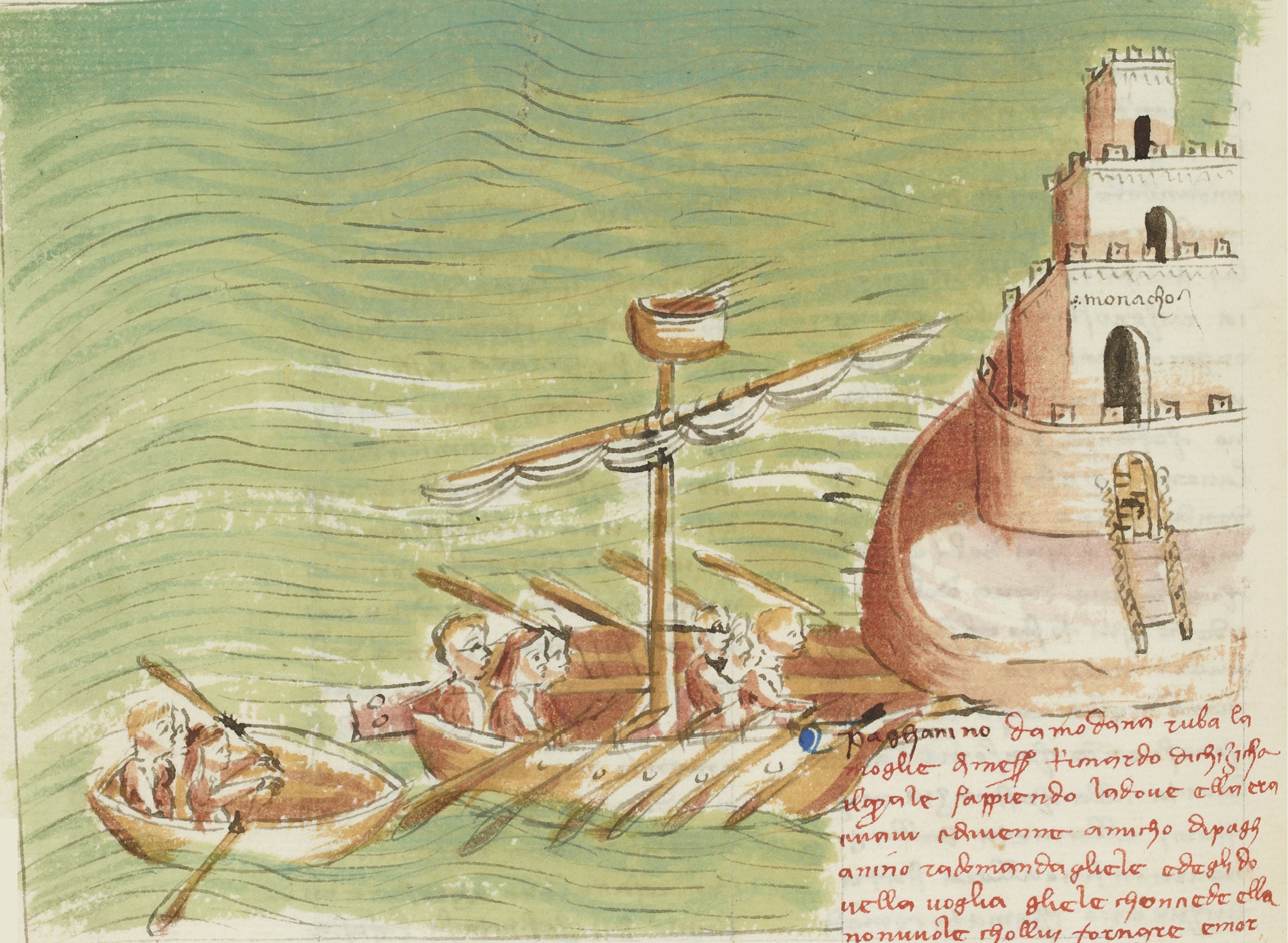 Parigi, Bibliothèque Nationale de France, It. 63, f. 84v. Il copista del manoscritto, datato 10 ottobre 1427, è Ludovico di Salvestro Ceffini. Paganino e Bartolomea approdano al castello di Monaco.