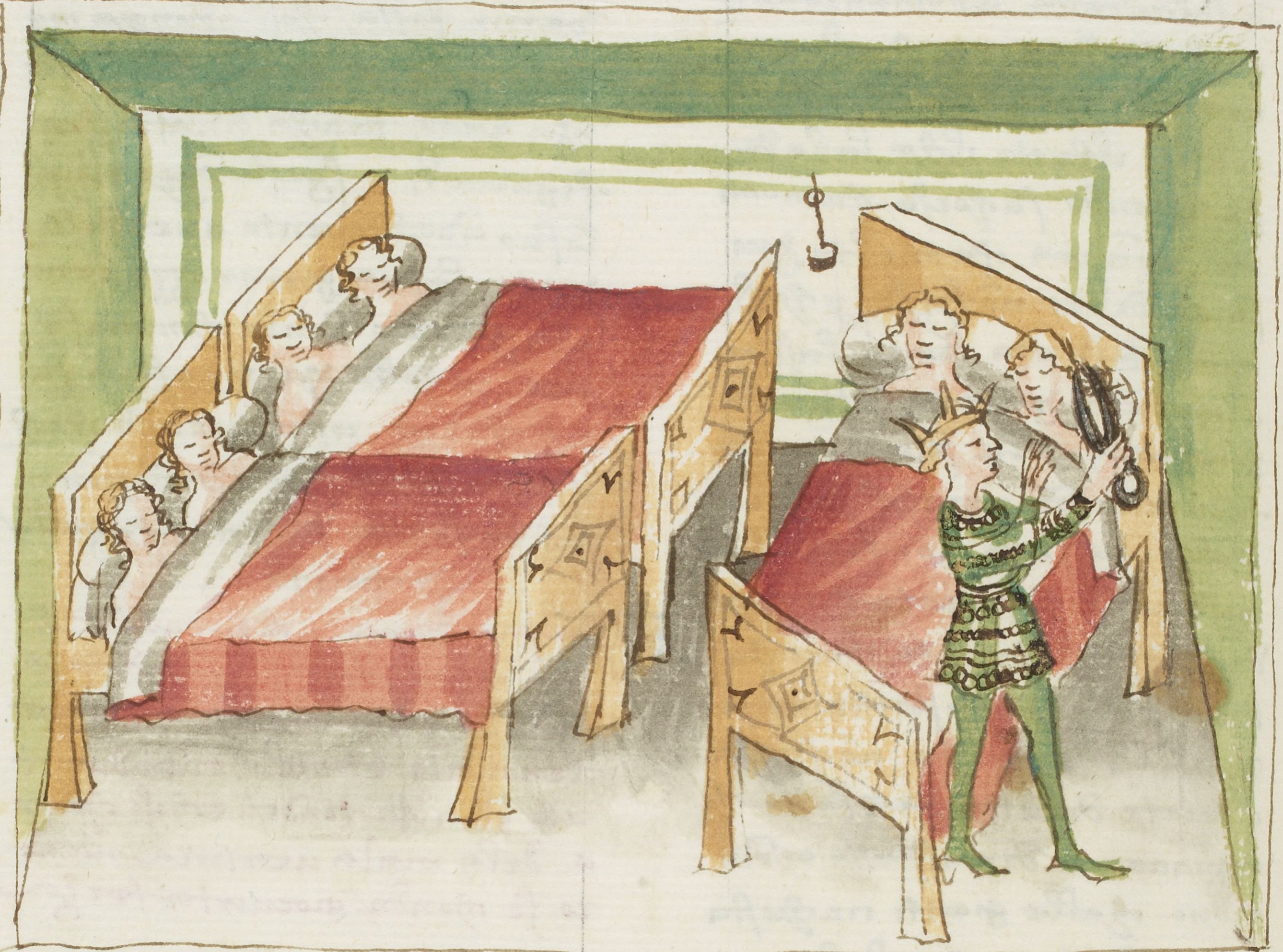 Parigi, Bibliothèque Nationale de France, It. 63, f. 94v. Il copista del manoscritto, datato 10 ottobre 1427, è Ludovico di Salvestro Ceffini. Il re Agilulf, recatosi nei quartieri della servitù, taglia una ciocca di capelli ad un servo che si finge addormentato.