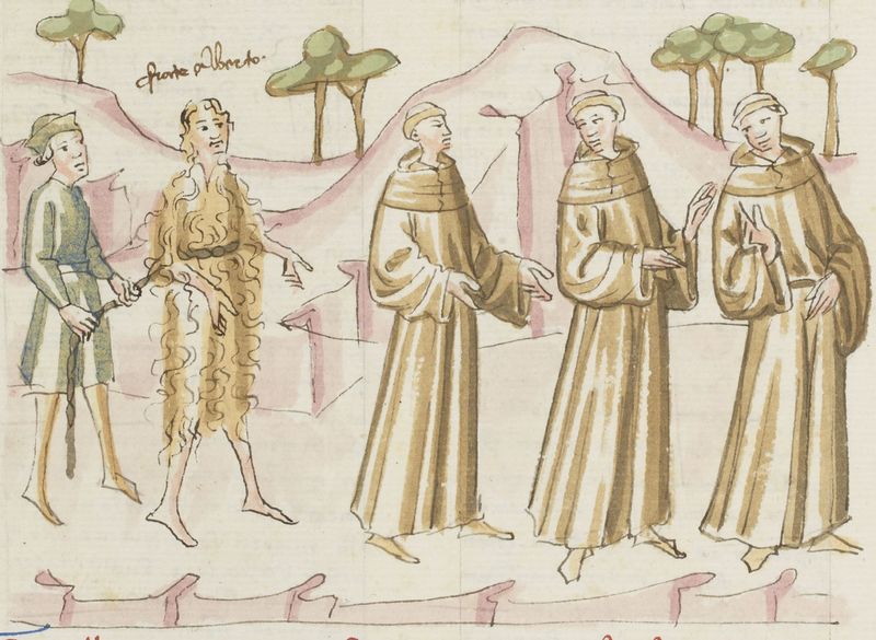 Parigi, Bibliothèque Nationale de France, It. 63, f. 138r. Il copista del manoscritto, datato 10 ottobre 1427, è Ludovico di Salvestro Ceffini. Frate Alberto, vestito da uomo selvatico, viene trascinato per strada e riconosciuto da tre frati.
