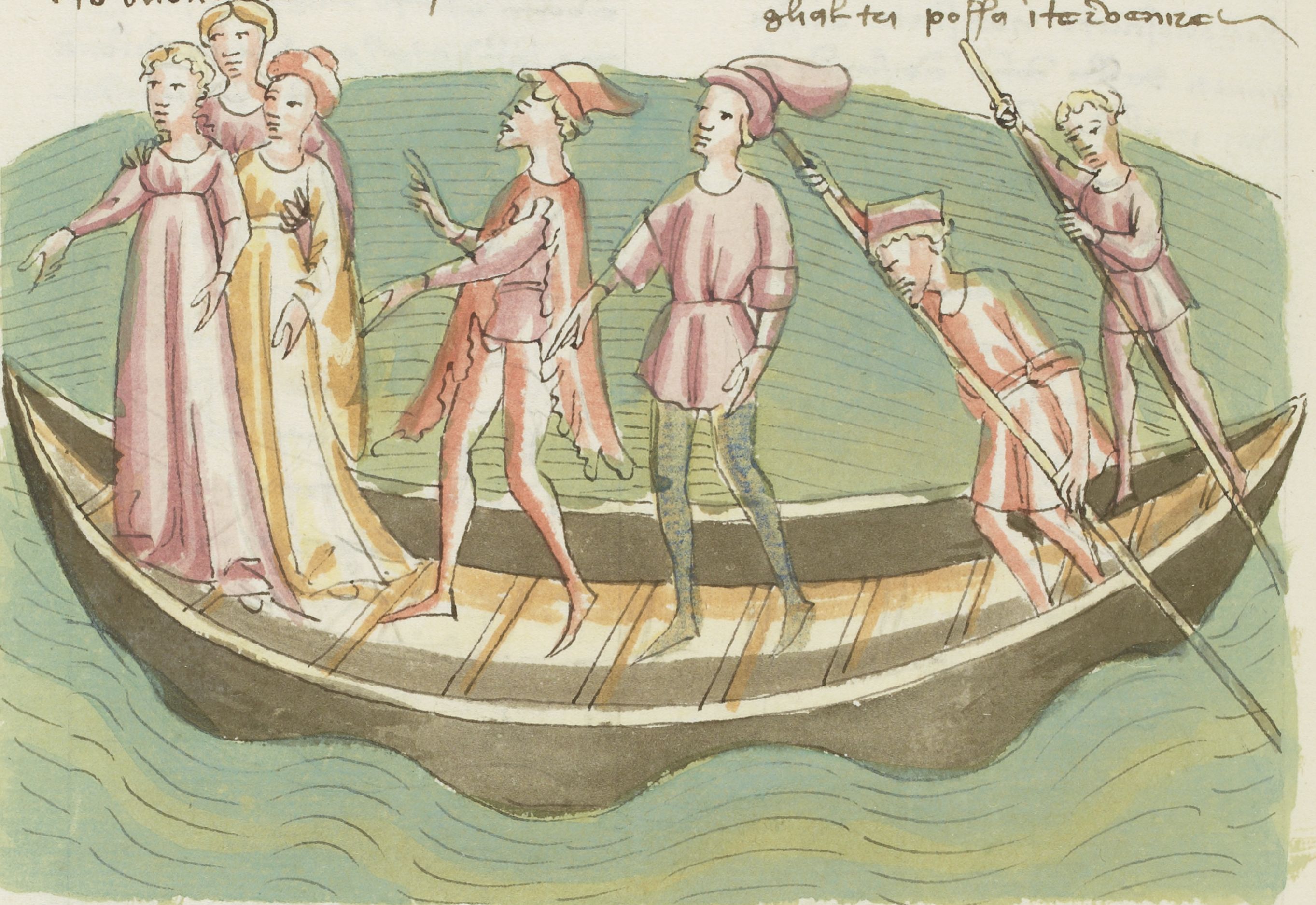 Parigi, Bibliothèque Nationale de France, It. 63, f. 142v. Il copista del manoscritto, datato 10 ottobre 1427, è Ludovico di Salvestro Ceffini. Tre coppie di giovani e un rematore viaggiano su una nave verso Creta.