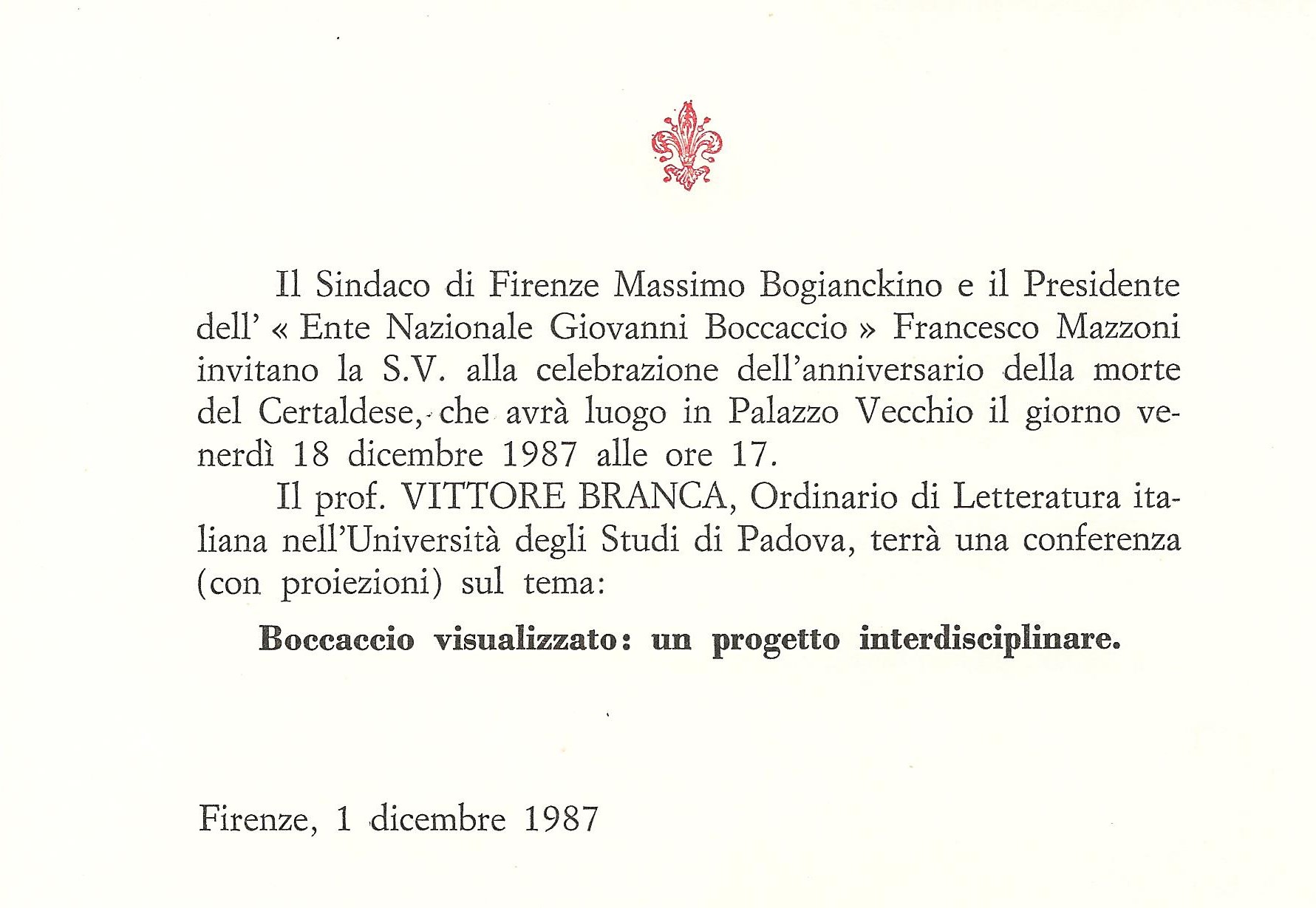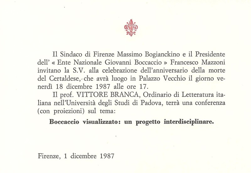 A ricordo dell'anniversario della morte di Giovanni Boccaccio, il prof. Vittore Branca (Università degli Studi di Padova) terrà una conferenza sul tema