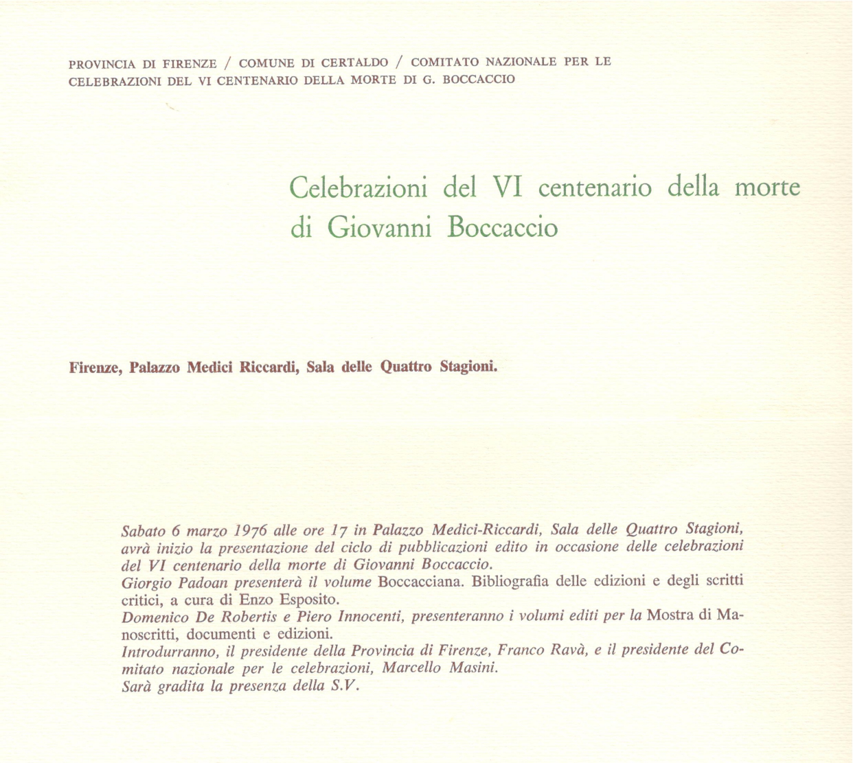 Mostra di manoscritti, documenti e edizioni. 6 centenario della morte di Giovanni Boccaccio, Firenze, Biblioteca Medicea Laurenziana, 22 maggio - 31 agosto 1975