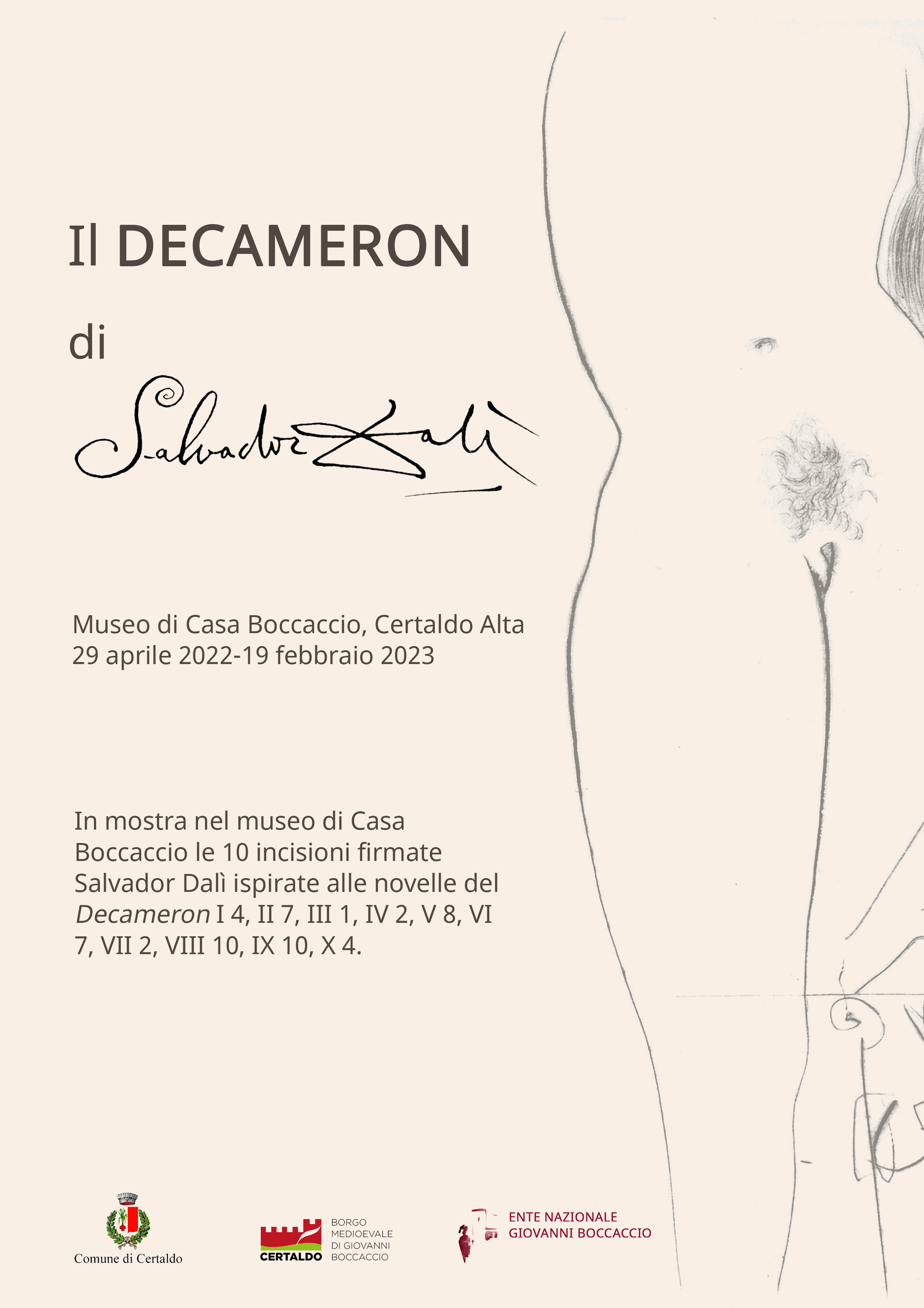 In mostra le 10 incisioni firmate Salvador Dalì ispirate al Decameron di Boccaccio. Salvador Dalì nel 1972 delineò 10 immagini per punte secche che avrebbero corredato l'edizione di un corposo volume, a fogli sciolti, oggi conosciuto come "Il Decameron di Dalì". Il volume ebbe tre edizioni a tiratura limitata con testi in italiano, in inglese e in svedese. La Biblioteca dell'Ente Nazionale Giovanni Boccaccio è in possesso della copia con testi in italiano numero 98/150 -
