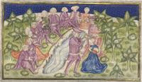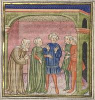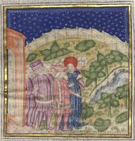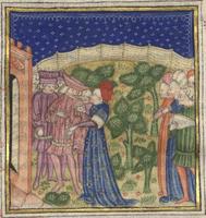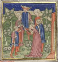 Kassel, Universitätsbibliothek Kassel, Landesbibliothek und Murhardsche Bibliothek der Stadt Kassel, 2° poet. et roman. 3, f. 145r. Gli amici di Filocolo accolgono il suo ritorno alle porte della città.