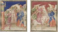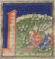Kassel, Universitätsbibliothek Kassel, Landesbibliothek und Murhardsche Bibliothek der Stadt Kassel, 2° poet. et roman. 3, f. 143v. La carta presenta due miniature: Filocolo giustifica le sue azioni dinanzi all'arabo Sadoc e ai suoi sergenti; Filocolo segue Sadoc ed i suoi uomini a cavallo.