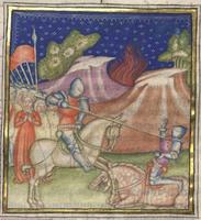 assel, Universitätsbibliothek Kassel, Landesbibliothek und Murhardsche Bibliothek der Stadt Kassel, 2° poet. et roman. 3, f. 129r. È raffigurata la decima questione d'amore: due cavalieri si sfidano a duello per una donna condotta al rogo.