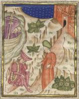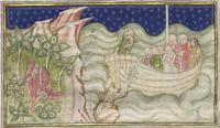 Kassel, Universitätsbibliothek Kassel, Landesbibliothek und Murhardsche Bibliothek der Stadt Kassel, 2° poet. et roman. 3, f. 135v. Seduto melanconicamente nel giardino, Filocolo ha una visione: una gigantesca figura femminile tenta di affondare una barca sulla quale si trovano una fanciulla nuda abbracciata da un giovane e lo stesso Filocolo, insieme alle personificazioni delle tre Virtù teologali e delle quattro Virtù cardinali.