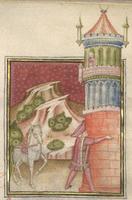 Kassel, Universitätsbibliothek Kassel, Landesbibliothek und Murhardsche Bibliothek der Stadt Kassel, 2° poet. et roman. 3, f. 143r. Filocolo, smontato da cavallo, abbraccia la torre in cui è rinchiusa Biancifiore.
