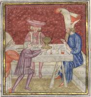 Kassel, Universitätsbibliothek Kassel, Landesbibliothek und Murhardsche Bibliothek der Stadt Kassel, 2° poet. et roman. 3, f. 145v. Filocolo siede a tavola con Sadoc mentre Parmenione offre in dono all'arabo, da parte di Filocolo, una coppa d'oro piena di frutta.