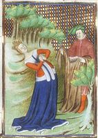 Londra, British Library, Royal 20 C V, f. 124v. Giulia sviene alla vista degli abiti insanguinati del marito portati da un messo.