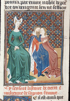 Londra, British Library, Royal 16 G V, f. 74r. Leonzio, in piedi accanto ad un leggio, viene abbracciata da un ammiratore.