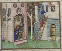 Parigi, Bibliothèque de l'Arsenal, 5070, f. 103v. Il copista del manoscritto è Guillebert de Mets. Una donna si confessa in chiesa con un prete; la donna riceve la visita del suo innamorato, che si introduce nella casa servendosi di una scala.