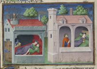 Parigi, Bibliothèque de l'Arsenal, 5070, f. 195r. Il copista del manoscritto è Guillebert de Mets. Lizio da Valbona sorprende la figlia Caterina a letto con l'amante Ricciardi; Lizio acconsente al matrimonio della coppia.