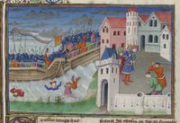 Parigi, Bibliothèque de l'Arsenal, 5070, f. 159r. Il copista del manoscritto è Guillebert de Mets. Gerbino abborda la nave della figlia del re di Tunisi, la quale viene uccisa e gettata in mare; il re di Tunisi, alla presenza di Guglielmo II di Sicilia, fa decapitare Gerbino.