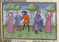 Parigi, Bibliothèque de l'Arsenal, 5070, f. 281r. Il copista del manoscritto è Guillebert de Mets. Calandrino, ingannato da Maso del Saggio, insieme a Bruno e Buffalmacco cerca l'elitropia nel torrente Mugnone; vittima della beffa dei suoi amici, Calandrino bastona sua moglie.