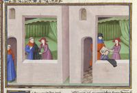 Parigi, Bibliothèque de l'Arsenal, 5070, f. 254v. Il copista del manoscritto è Guillebert de Mets. Arimino, travestito da prete, ascolta la confessione della moglie; di notte l'uomo monta la guardia davanti alla porta di casa.