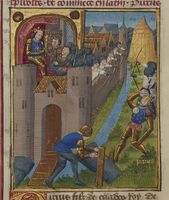 Parigi, Bibliothèque Nationale de France, Fr. 234, f. 31r. Durante l'assedio di Argo, Pirro viene colpito a morte da un masso lanciato da una catapulta; un soldato presenta la testa di Pirro ad Antigono re di Macedonia.