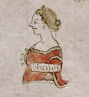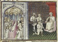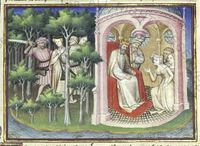 Città del Vaticano, Biblioteca Apostolica Vaticana, Pal. lat. 1989, f. 29v. Il copista del manoscritto, datato 15 giugno 1414, è Laurent de Premierfait. Una gentildonna di Guascogna viene aggredita da un uomo armato sull'isola di Cipro; la donna, in ginocchio al cospetto del re, chiede giustizia per le ingiurie subite.