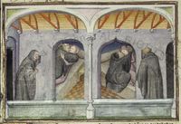 Città del Vaticano, Biblioteca Apostolica Vaticana, Pal. lat. 1989, f. 20r. Il copista del manoscritto, datato 15 giugno 1414, è Laurent de Premierfait. L'abate sorprende un giovane monaco peccare di lussuria con una donna; in seguito il monaco, a sua volta, spia l'abate mentre bacia una donna nella sua cella.