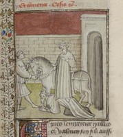 Parigi, Bibliothèque interuniversitaire Sainte-Geneviève, 1128, f. 280r. Zenobia, regina di Palmira, si arrende all'imperatore Aureliano.