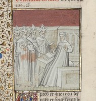 Parigi, Bibliothèque interuniversitaire Sainte-Geneviève, 1128, f. 276r. Giovanni Boccaccio incontra i re Sapore e Valeriano.