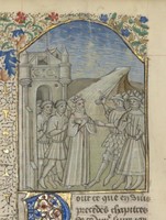 Parigi, Bibliothèque interuniversitaire Sainte-Geneviève, 1128, f. 312v. Giovanni Boccaccio incontra un gruppo di sfortunati.