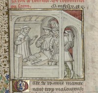 Parigi, Bibliothèque interuniversitaire Sainte-Geneviève, 1128, f. 308r. Giovanni Boccaccio incontra un gruppo di sovrani sfortunati.