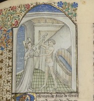 Parigi, Bibliothèque interuniversitaire Sainte-Geneviève, 1128, f. 291v. Giovanni Boccaccio rimprovera tre bestemmiatori.