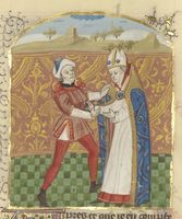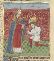 Parigi, Bibliothèque de l'Arsenal, 5192, f. 328r. Papa Clemente IV incorona Carlo d'Angiò.