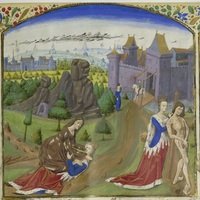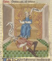 Parigi, Bibliothèque Nationale de France, Fr. 597, f. 2r. Adamo ed Eva, vestiti di pelli d'animale, appaiono a Giovanni Boccaccio; sullo sfondo, Caino uccide Abele; Lamech, armato di arco e frecce, uccide il suo antenato Caino nascosto in un cespuglio.