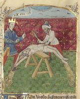 Parigi, Bibliothèque de l'Arsenal, 5192, f. 327r. Un sovrano viene decapitato da due uomini.