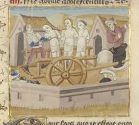 Parigi, Bibliothèque de l'Arsenal, 5192, f. 341r. Filippa da Catania e i suoi due figli, Roberto e Sancia, vengono torturati mentre viaggiano su un carro verso il luogo dove saranno giustiziati.