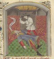 Parigi, Bibliothèque de l'Arsenal, 5192, f. 298v. Narsete strangola Sindualdo, comandante degli Eruli.