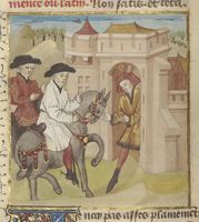Parigi, Bibliothèque de l'Arsenal, 5192, f. 158r. Giovanni Boccaccio incontra due uomini.