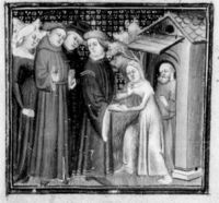Parigi, Bibliothèque Nationale de France, Fr. 12459, f. 136r. Il copista del manoscritto, datato 21 aprile 1414, è Jehan de Lengres. Gualtieri, avendo scelto Griselda come sua sposa, si reca con il suo seguito presso la casa di Giannucole per incontrare la fanciulla.