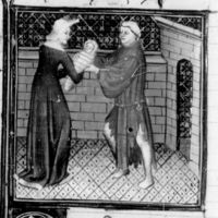 Parigi, Bibliothèque Nationale de France, Fr. 2203, f. 1r. Il manoscritto è datato 1395. Gualtieri di Saluzzo esce dal palazzo per andare a caccia col falcone, osservato da un uomo seduto sotto un albero (Giovanni Boccaccio?) che scrive su un rotolo di pergamena.