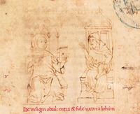 Firenze, Biblioteca Riccardiana, Ricc. 991, f. 1r. Giovanni Boccaccio offre un libro a Francesco Petrarca; entrambi i personaggi sono seduti in cattedra.