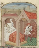 Parigi, Bibliothèque de l'Arsenal, 5192, f. 64v. Re Candaule mostra a Gige la bellezza della moglie addormentata.