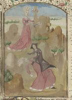 Parigi, Bibliothèque de l'Arsenal, 5192, f. 72v. La Povertà, rappresentata come una vecchia vestita di stracci, lotta con la Fortuna, una dama in abiti eleganti; la Sfortuna, raffigurata anch'essa come una dama, legata ad un palo.