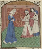 Parigi, Bibliothèque de l'Arsenal, 5192, f. 80r. Giovanni Boccaccio e Lucrezia incontrano tre uomini.