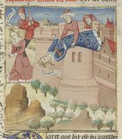 Parigi, Bibliothèque de l'Arsenal, 5192, f. 34r. Un uomo scala le mura di una città per raggiungere la sua amata.