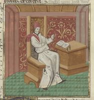 Parigi, Bibliothèque de l'Arsenal, 5192, f. 51r. Giovanni Boccaccio siede dinanzi ad un leggio nel suo studio.