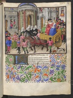 Vienna, Österreichische Nationalbibliothek, 2617, f. 39r. Teseo attraversa la città di Atene sul carro trionfale, avendo al suo fianco la regina delle Amazzoni Ippolita ed Emilia; lungo la strada siede un gruppo di vedove dei guerrieri tebani in atto di supplica.