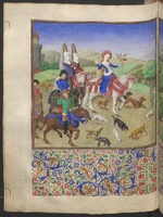 Vienna, Österreichische Nationalbibliothek, 2617, f. 76v. Emilia, recatasi a caccia col falcone insieme al suo seguito, incontra Arcita e Palemone mentre questi si sfidano a duello; l'illustrazione è da leggersi in continuità con quella adiacente al f. 77r.