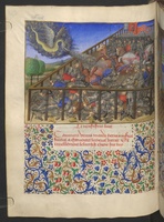 Vienna, Österreichische Nationalbibliothek, 2617, ff. 18v-19r. L'illustrazione di estende su due carte, e rappresenta lo sbarco dell'esercito greco guidato da Teseo e la battaglia contro le guerriere Amazzoni.