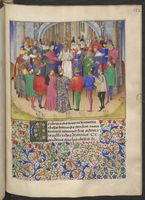Parigi, Bibliothèque Nationale de France, Fr. 25528, f. 4v. Il copista del manoscritto è Pierre d'Amboise. Troiolo scorge Criseide durante una celebrazione al tempio di Atena e se ne innamora.