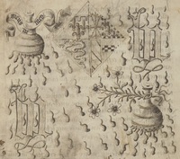 Parigi, Bibliothèque Nationale de France, Fr. 25528, f. 1r. Il copista del manoscritto è Pierre d'Amboise. Al centro sono rappresentate le armi di Maria di Clèves all'interno di una losanga, circondate dalle sue iniziali e dal suo emblema, un imbottavino, reiterato due volte.