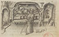 Parigi, Bibliothèque Nationale de France, Fr. 25528, f. 9v. Il copista del manoscritto è Pierre d'Amboise. Pandaro si reca nella stanza dell'amico Troiolo, il quale giace a letto vinto dalle sofferenze d'amore.