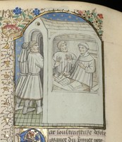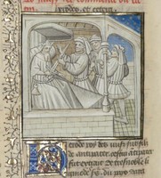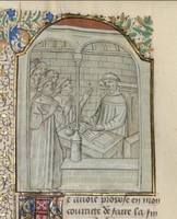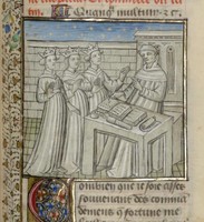 Parigi, Bibliothèque interuniversitaire Sainte-Geneviève, 1128, f. 231r. Giovanni Boccaccio incontra un gruppo di scrivani.