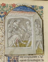 Parigi, Bibliothèque interuniversitaire Sainte-Geneviève, 1128, f. 233r. Giovanni Boccaccio incontra un gruppo di sfortunati coperti di ferite.